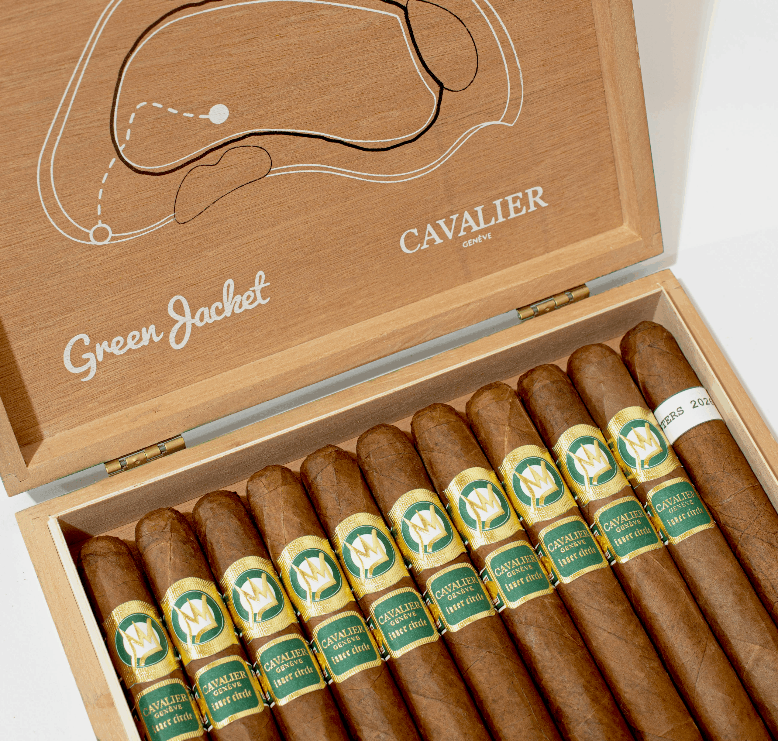 The Green Jacket is a 7 x 47 Churchill size that comes in an eleven-count box. Ten of the cigars are the 2026 blend that were the 2025 11th muestra cigar found in the current year’s release boxes. These cigars come with green inner circle bands. The eleventh cigar is the future 2027 blend which comes with a plain factory band from the Cavalier factory, FCT, to differentiate them.