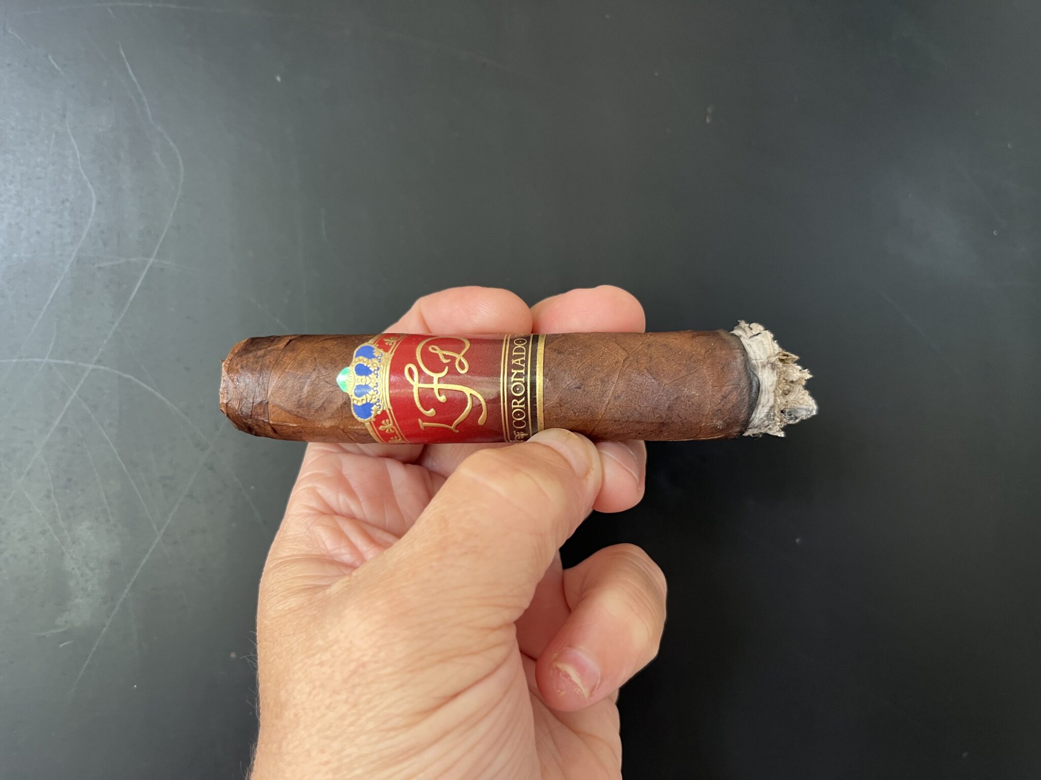 All three cigars in review have a brindle pattern with two shades of brown splotching throughout. The seams are easily visible and a bit fray. The band features a smooth candy-apple polished red background that will gleam like a jewel on a humidor shelf with the initials LFD in an eye-catching gold color. Just below the LFD initials also in gold is the name “Coronado” in a clean blocked style lettering against a muted brick-brown panel. At the top, sits a modest gold – outlined crown, its interior filled with soft baby-blue and turquoise. The overall look is balanced and straightforward. Coronado, meaning “crowned” adds a subtle nod to its name without overwhelming the design. The cap is applied symmetrical. Softness in some areas is apparent while gently squeezing especially at the head of the cigar. After removing the cellophane, the aroma of wet leather, earth, spice, and mustiness is obvious. I opted for a straight cut. The cold draw delivered a more prominent taste of wet leather, earth and some pepper. I took my time and toasted the foot with a single torch lighter.