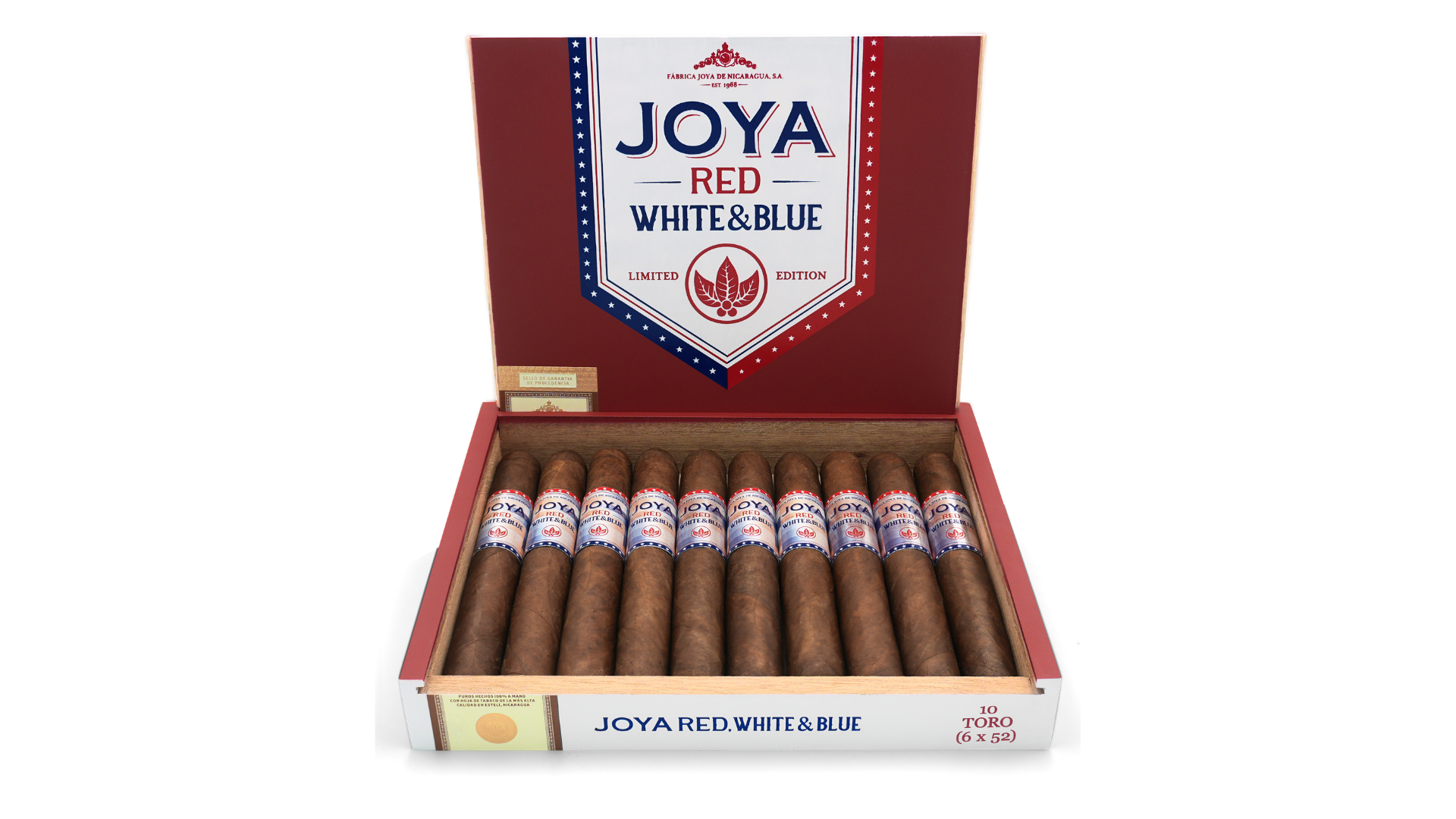 With a limited production of 500 boxes, Joya Red White and Blue will be presented in ten-count boxes in a traditional Toro (6 x 52) format, with an MSRP of $13.50 per cigar and $135 per box. The cigar will make its official debut to retailers at the PCA Convention & Trade Show in New Orleans, with shipments to U.S. cigar shops scheduled to begin in early June 2026.