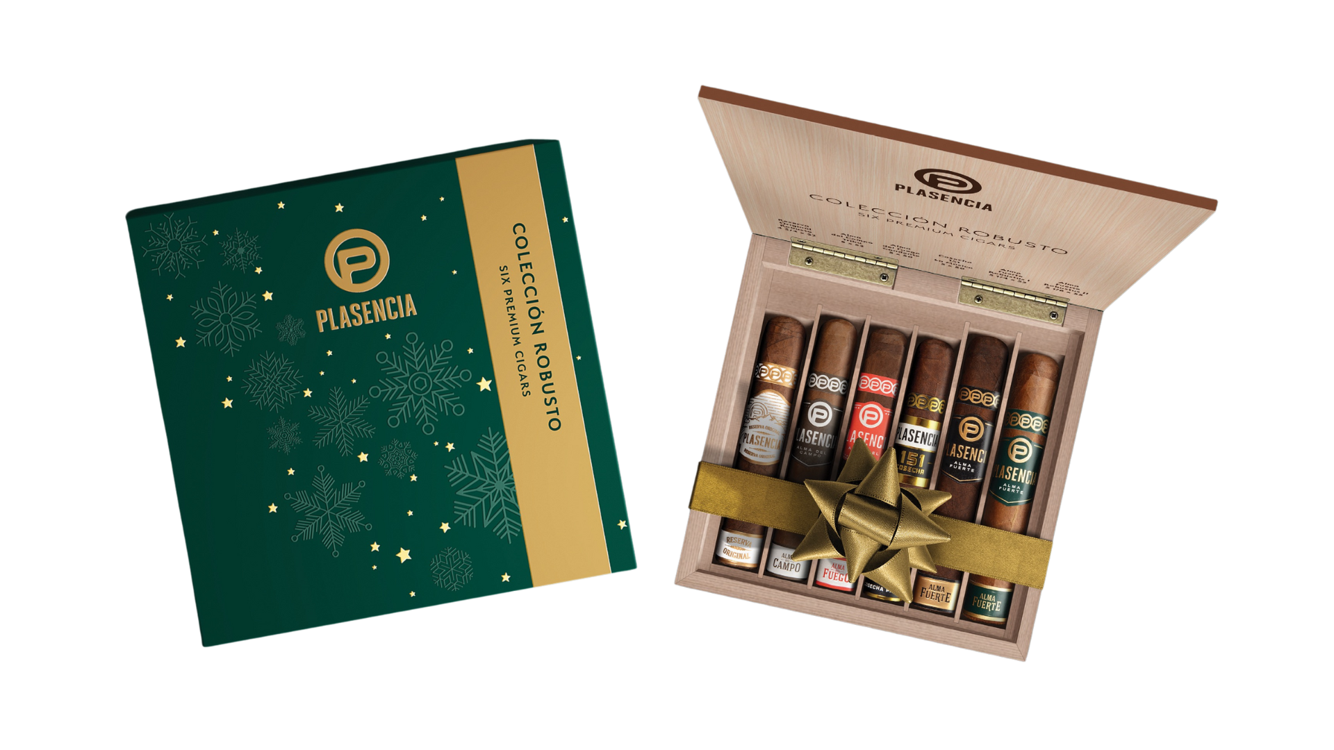 Encased in a festive green sleeve adorned with gold-foil stars and textured snowflake embossing, the Colección Robusto Holiday Edition captures the spirit of the season in true Plasencia fashion. The tactile design shimmers under light, evoking winter’s magic through craftsmanship and detail. On the back, varnished images of the six featured cigars celebrate the artistry within — a visual invitation to explore Plasencia’s finest creations. Sophisticated yet joyful, the sleeve transforms this limited release, perfect for gifting or marking moments of celebration.